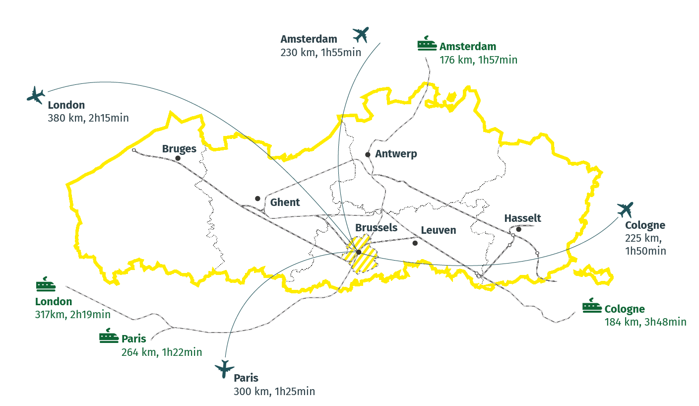 Brussels Airport (Zaventem) ±140 international and regional carriers serve Belgium’s International Airport, from more than 70 international cities. Ghent can easily be reached from the airport: By train: direct connection, every half hour, journey time: less than 1h By taxi: 45 minutes driving Private shuttles (taxi): ≠ € 60 one way At the airport we can provide a lounge to rest while waiting on the train or coach that will bring you to Ghent.